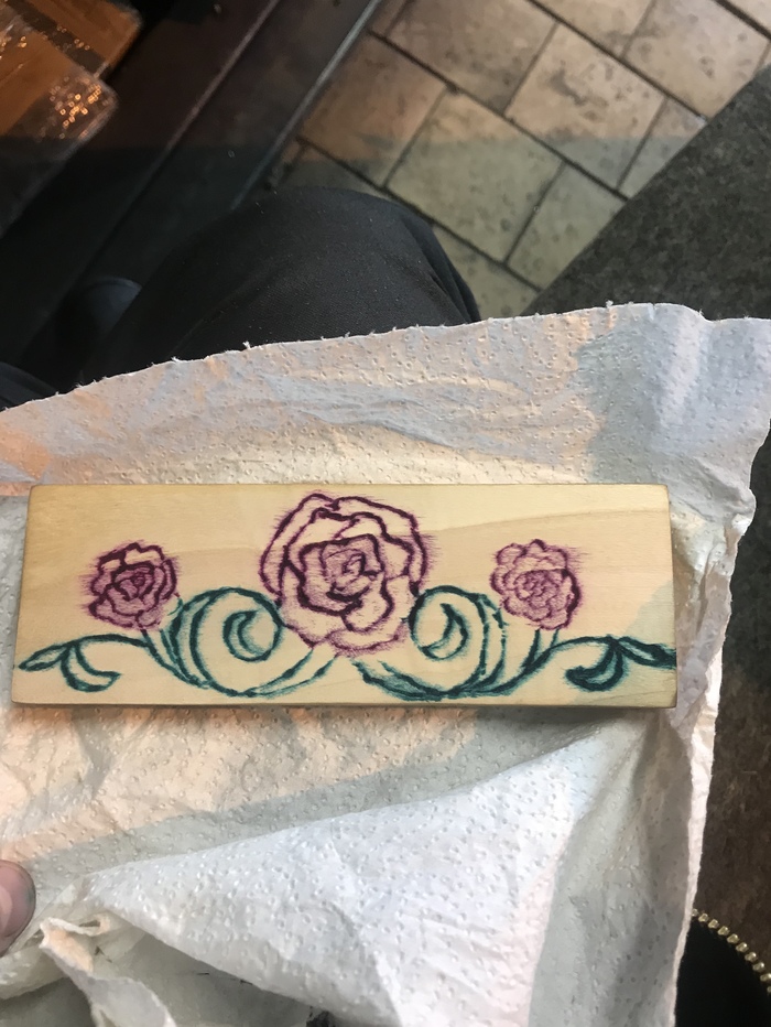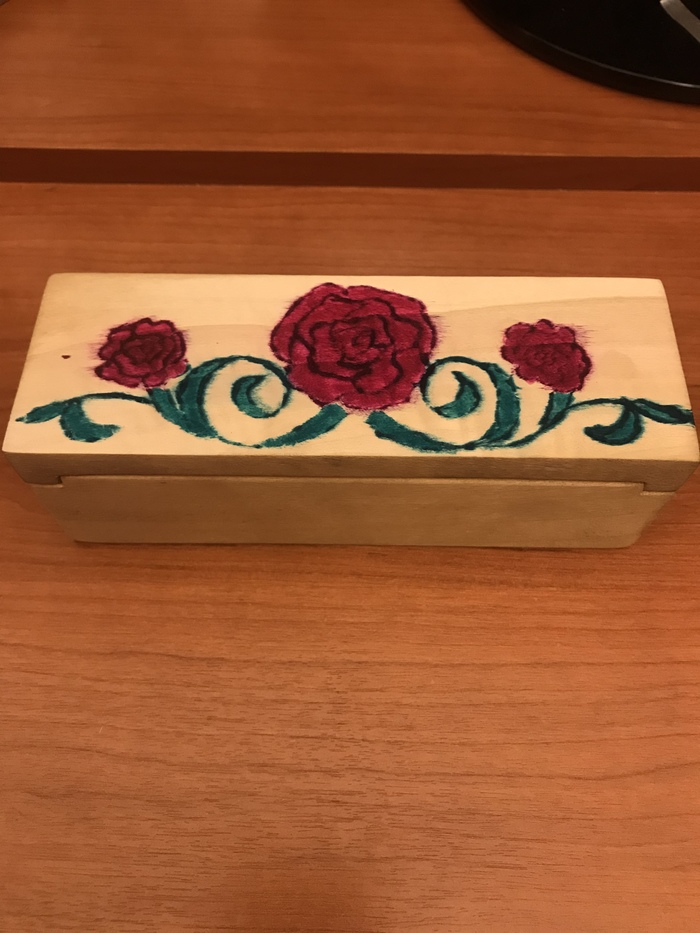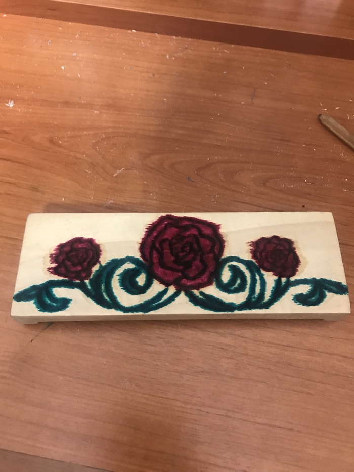 И в конечном итоге раскрасил. Так как даже детской акварели или гуаши дома не нашлось, красил я зелёнкой и фукорцином. Однако, они довольно сильно растеклись и въелись в верхний слой древесины.