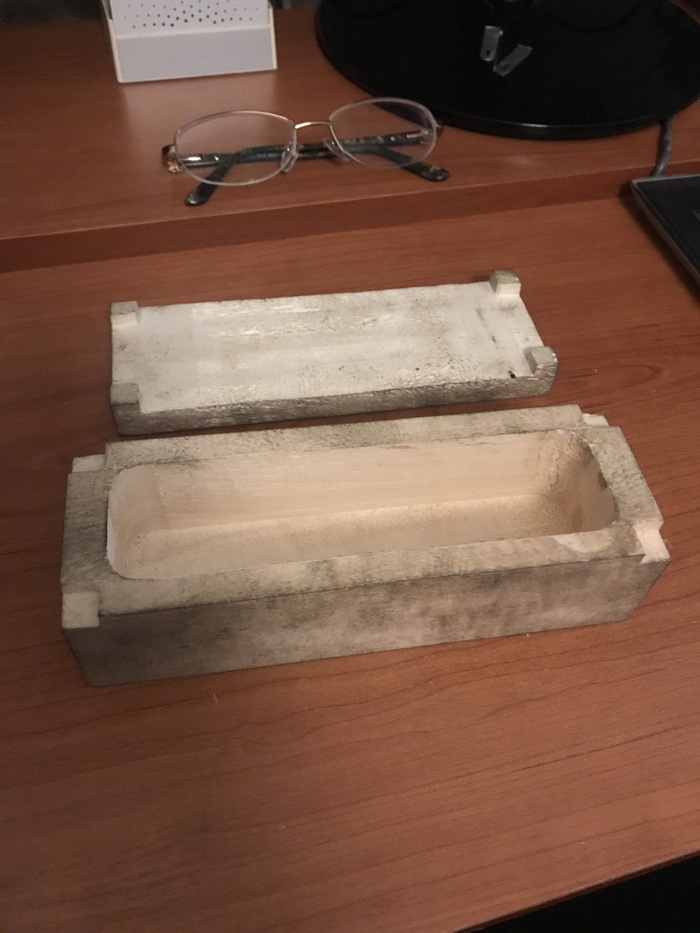 Так как маленьких петелек под рукой не оказалось, было решено делать пазовое соединение. В основании, по углам, я сделал обнизки, 5х10х10мм, а на крышке, соответственно, ответные выступы, 5х10х10мм. Получился такой неопрятный и грязненький гробик для мелких домашних животных.