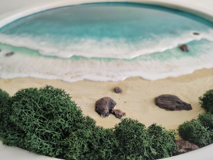Следом было залито ещё два слоя смолы, и наконец я приступила к извечной борьбе с волнами) Также добавила немного стабилизированного мха)