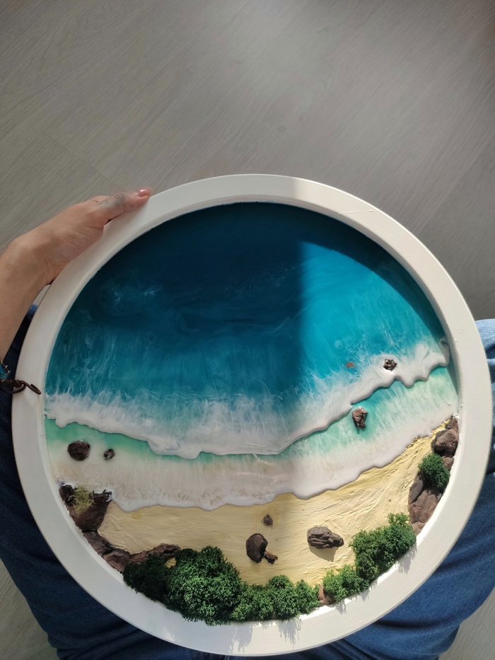 Сегодня я хочу немного рассказать вам о том, как я пришла к тому, чтобы начать работать со смолой. Моё первое знакомство со смолой произошло прошлым летом. Вдоволь насмотревшись на нереальные работы зарубежных смолянистов, я решила заказать себе готовый набор для создания моря. Тогда я была на 100% уверена, что у меня с первого раза получится ничуть не хуже, чем у других)) Ноо не тут то было)) Я абсолютно не понимала что из себя представляет смола, как она работает, и что делать с мелкими пузырьками. В конечном итоге моя первая работа выглядела как - то так