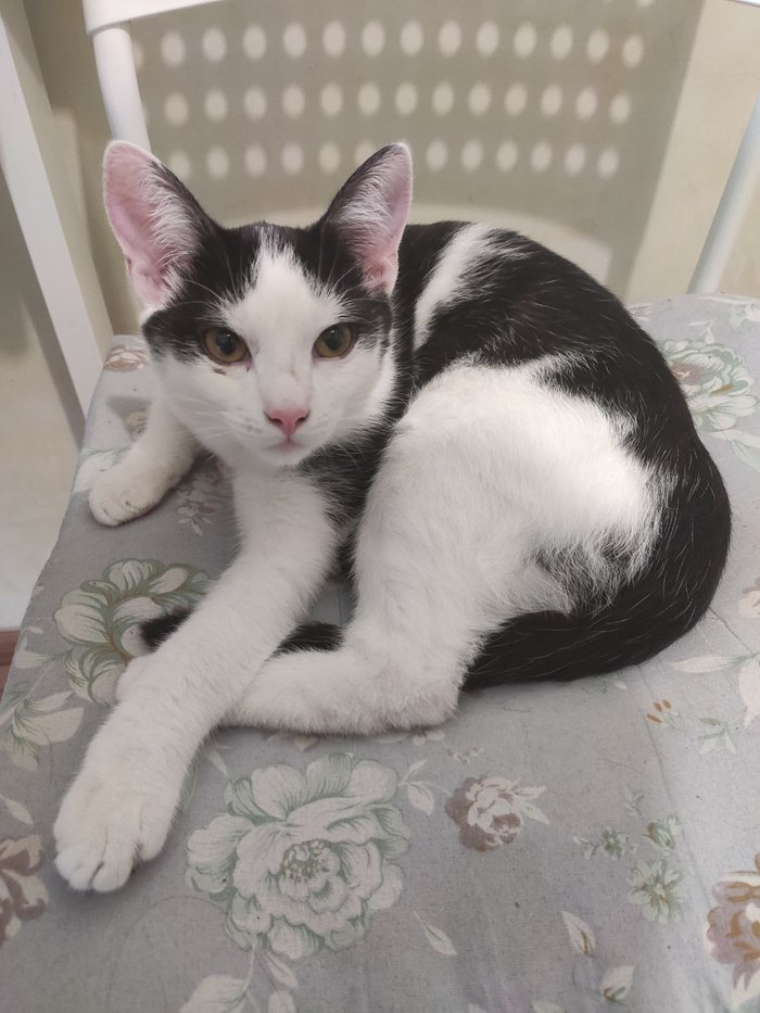 Возраст: 5-6 месяцев. Точно домашний, поскольку есть ошейник и лоток признал сразу без объяснений. Очень ласковый и общительный. Показали ветеринару: кожных заболеваний нет, здоров, просглистогонили, провели обработку против блох/клещей. Ест и сухой, и влажный корма.