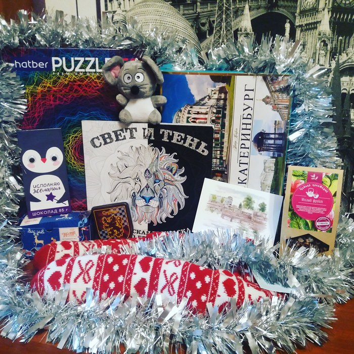 Мой чудесный Тайный Санта учел все мои пожелания! Паззл на 1500 деталей (рисунок мозгодробительный, но будет чем заняться в праздничные дни, как раз передают морозы до -38, не скучно будет дома сидеть), коробка конфет, шоколадка, фруктовый чай, раскраска антистресс, носки, мышка игрушка, конфетки Гриффиндор, гирлянда, открытка🌲 Это очень круто!