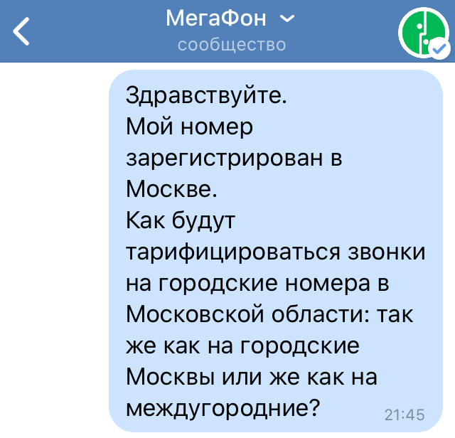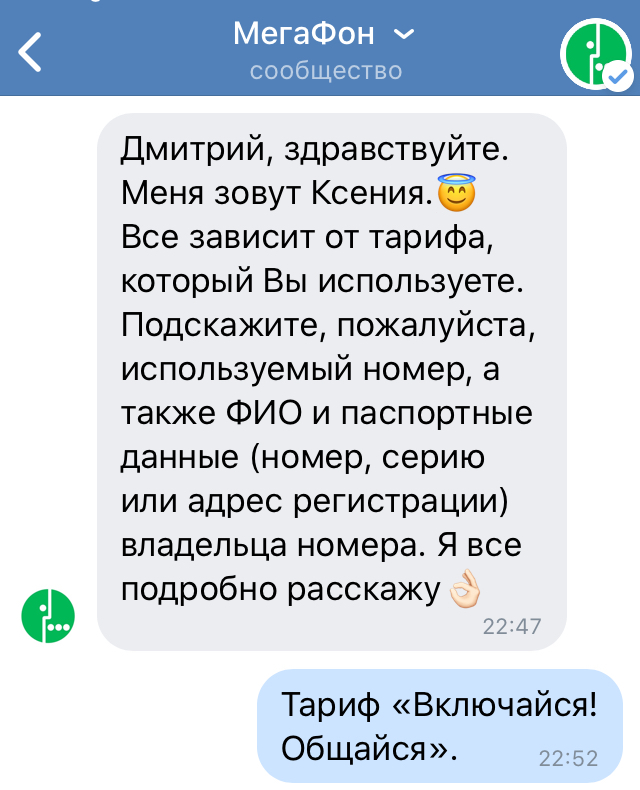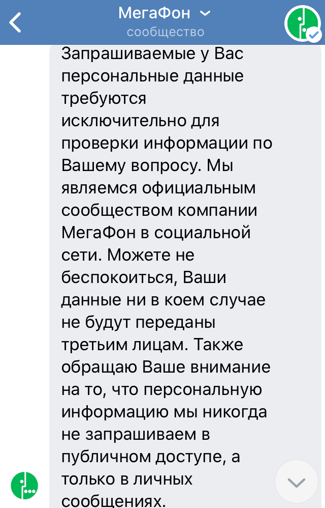 Пишу в личку «Мегафоновского» сообщества «ВКонтакте» безобидный вопрос.