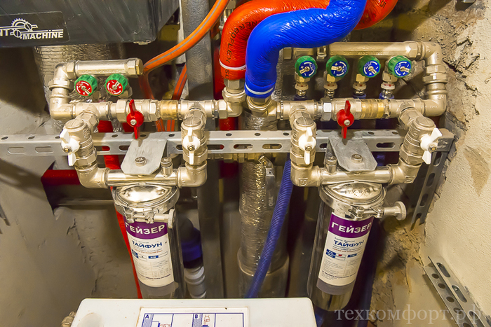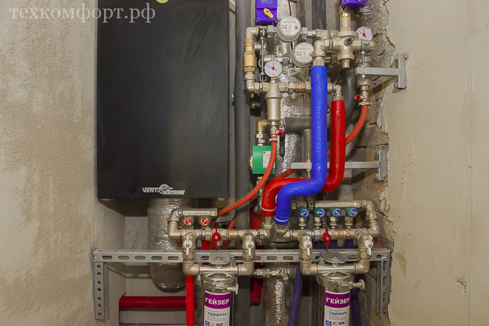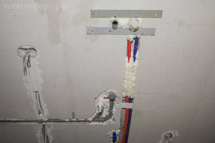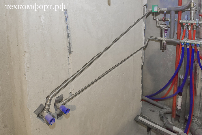 монтаж системы водоснабжения в новостройке, 2 санузла. Узел ввода резьбовые латунные фитинги и трубы из нержавеющей стали под пресс, разводка от коллектора до устройств водоразбора-трубы из сшитого полиэтилена.