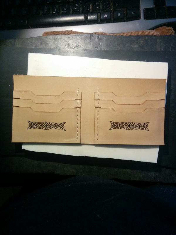 У изделия было несколько грубых и критических ошибок-косяков. Первый косяк это то, что сделал внешнюю деталь не сильно длиннее внутренней. Место для денег там вообще нет. Да и если карточки туда вставить уже закрывается крайне неохотно. А из-за того что я оттирал спиртом лишний тонер с птицы - кожа пошла волнами. Ну и торцы. Они мне вообще не понравились. Плюс птица явно не того размера и не на своем месте. Вязь тоже решил сделать несколько покрупнее.