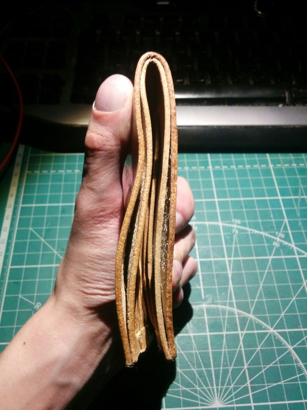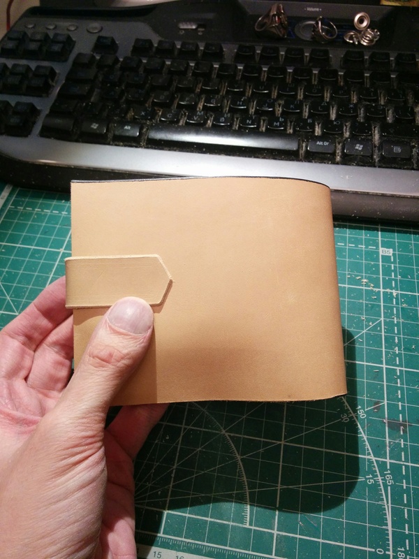 Склеил и понял, что надо делать язычок с кнопкой. Кожа толстая, если набить кошелек то он понемногу сам раскрывается. Не долго думая вырезал и зашкурил