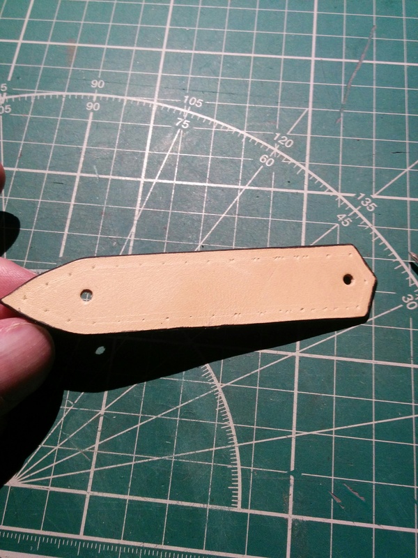 Разорвал склейку и пробил внешнюю деталь под клепки для язычка. пробил прошивку язычка и пришил его, предварительно покрыв его финишем.