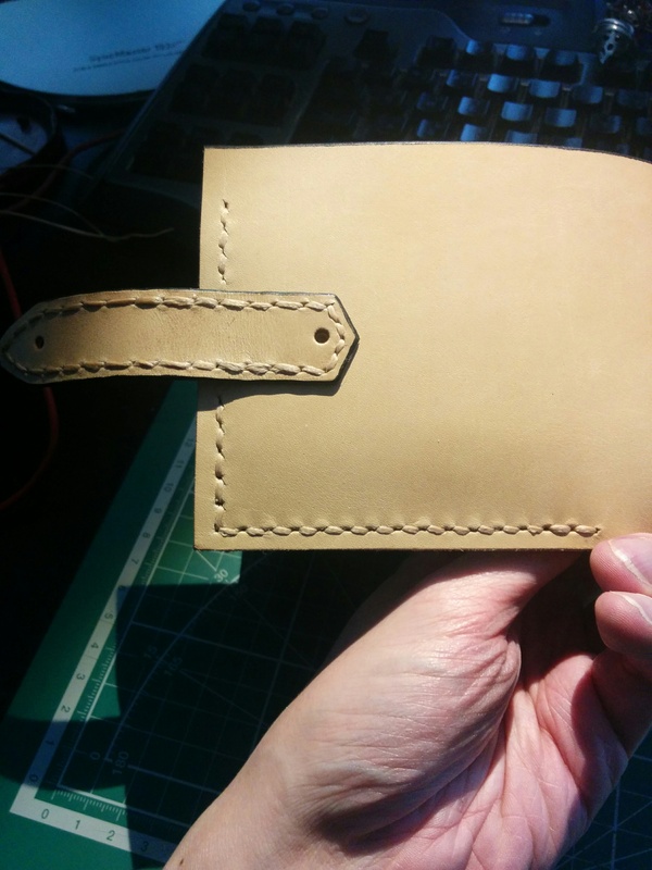 Пробил отверстия в язычке и наметил отверстия под клепки и прошивку. При этом я набил в кармашки карточек, а в отделение для купюр побольше бумаги. Ну откуда у меня деньги? :)