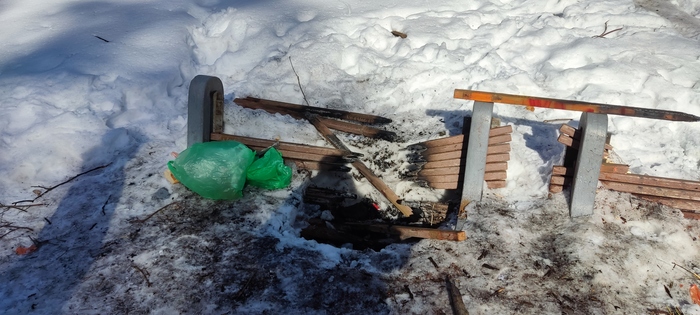 Пройдя на место обнаружили полную разруху. Сожжённые скамейки, сорванные и в последствии также сожжённые кормушки и свадебное дерево.