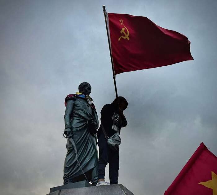 Флаг СССР у памятника Симону Боливару на акции протеста против нападения США на Венесуэлу и угроз со стороны правительства США против Колумбии.