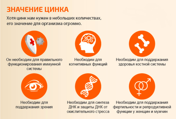 Цинк необходим для каталитической активности около 100 ферментов. Он участвует в иммунном ответе, синтезе белка, заживлении ран, синтезе ДНК и делении клеток, а ещё кости, тестостерон, когнитивные функции.