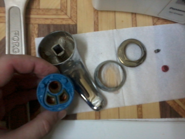 2.Откручиваем декоративный колпак и гайку, удерживающую картридж в корпусе смесителя.