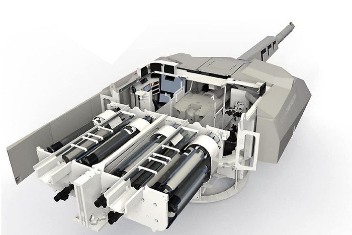 Всё это привело к тому, что максимальный боекомплект танка сократился до 20 выстрелов, что в принципе приемлемо, но и здесь кроется нюанс: если мы посмотрим на фотографии выставочного образца, то заметим, что на том месте, где располагается пусковая установка барражирующих боеприпасов HERO 120, по схеме должен находиться один из "магазинов" АЗ: