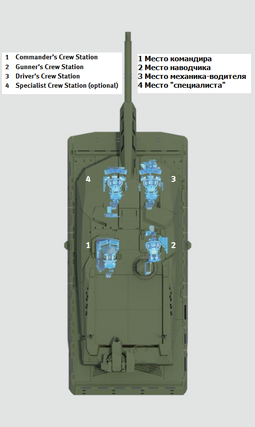 Вместе с исчезновением заряжающего отпала нужда и в корпусной боеукладке – в этом плане безопасность танка действительно повысилась, и теперь на этом месте опционально расположен опциональный четвёртый член экипажа – некий "специалист". Чем он должен заниматься, думаю, понятно – управлением этими самыми дронами, которыми конструкторы щедро нашпиговали свою машину.