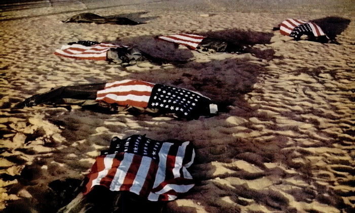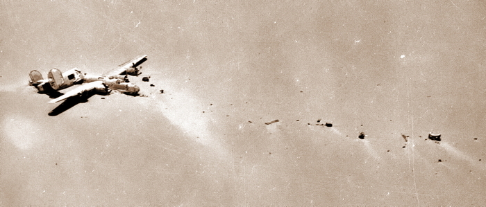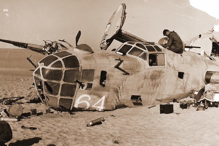 Примерно так выглядел с воздуха совершивший посадку без людей «Либерейтор» — с разломившимся пополам фюзеляжем и разбросанными далеко вперед обломками единственного работающего в момент столкновения с песками двигателя.