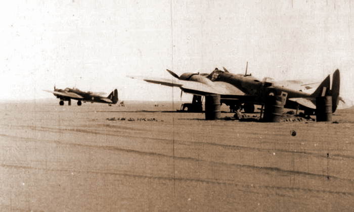 «Бленхеймы» Z7610 и T2252, замершие в безмолвной пустыне с пустыми баками. На переднем плане убогая могила восьми погибших здесь лётчиков.