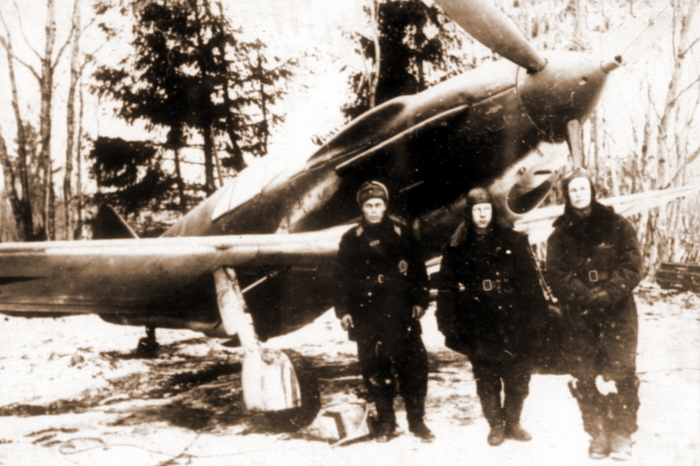 Заместитель командира эскадрильи 5-го гвардейского истребительного авиаполка Николай Городничев (справа) с техниками у своего истребителя ЛаГГ-3, Калининский фронт, зима 1941-1942 гг.