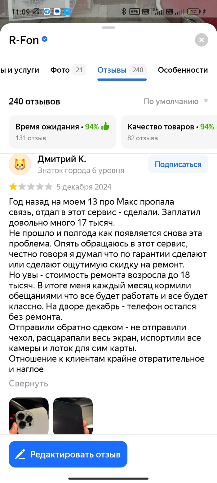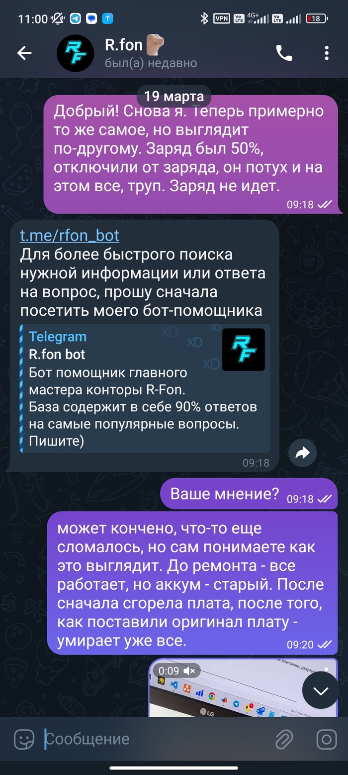 То есть, все ровно и факт ремонта и факт выхода из строя не связаны. Вроде, логично пишет. Но что же он пишет мне в телеграм?