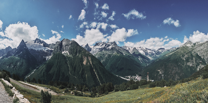 Домбай - курортный поселок среди Кавказских гор. Про сам поселок мне сказать нечего, как и про любое другое место, где мы останавливались. Типичное место, как я называю их, "для обсасывания туристов (как пиявки)". Но именно здесь я получил почти все то, ради чего ехал на Кавказ: ты живешь на высоте 1600 метров, со всех сторон тебя окружают снежные пики, достигающие высоты 4000 метров, свежий горный воздух.