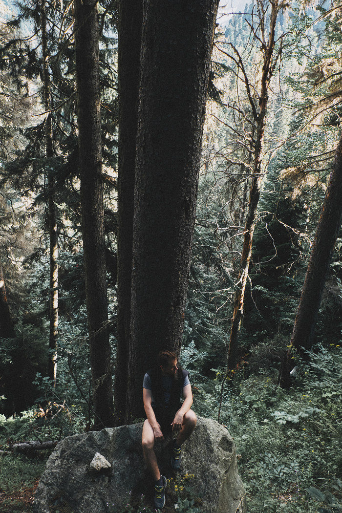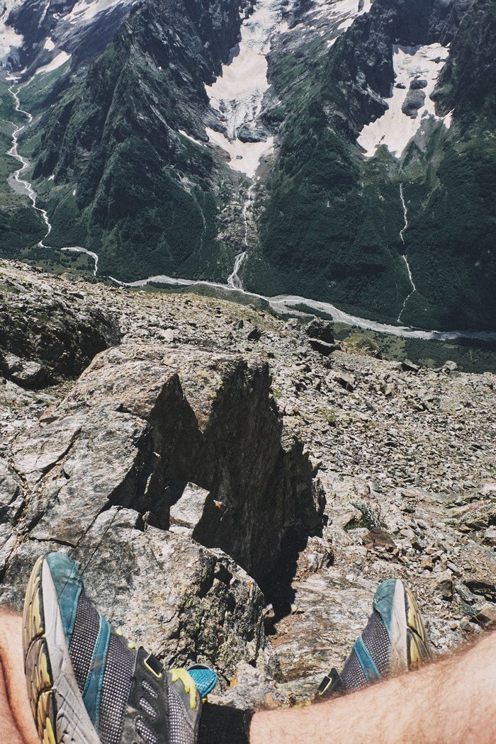 Идти туда так поздно было не очень умное решение, потому что до ледника мы шли около 2.5 часов, а тропинка там частично не самая приятная, в гору, да еще и через лес. Когда мы пришли к леднику, солнце уже село за горы, и тут мы поняли:"It was at this moment, Jackson knew he fucked up", потому что обратно нам пришлось идти в полной темноте через горный лес, а из людей там ни-ко-го. Кстати, до границы с Абхазией там рукой подать.