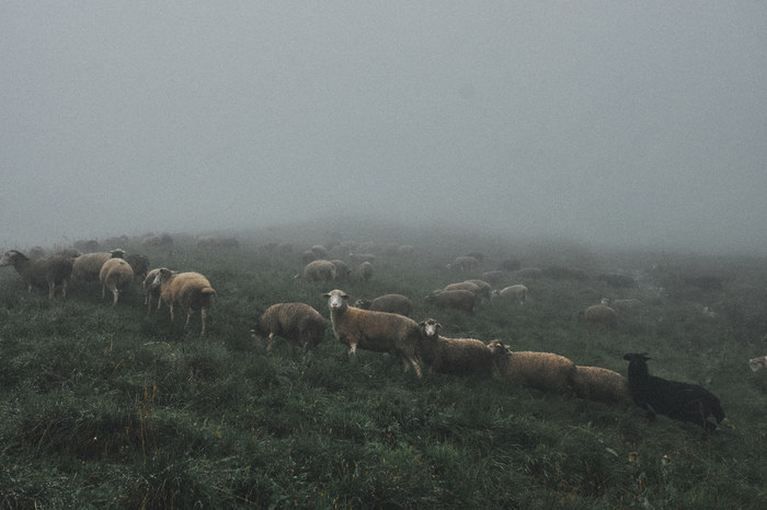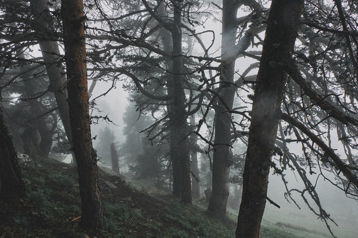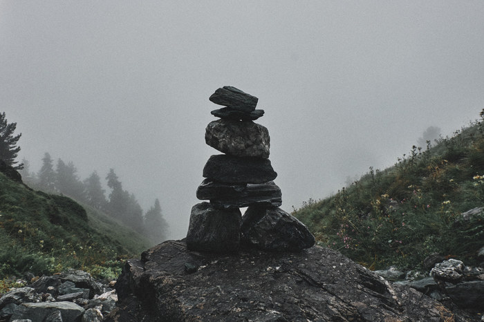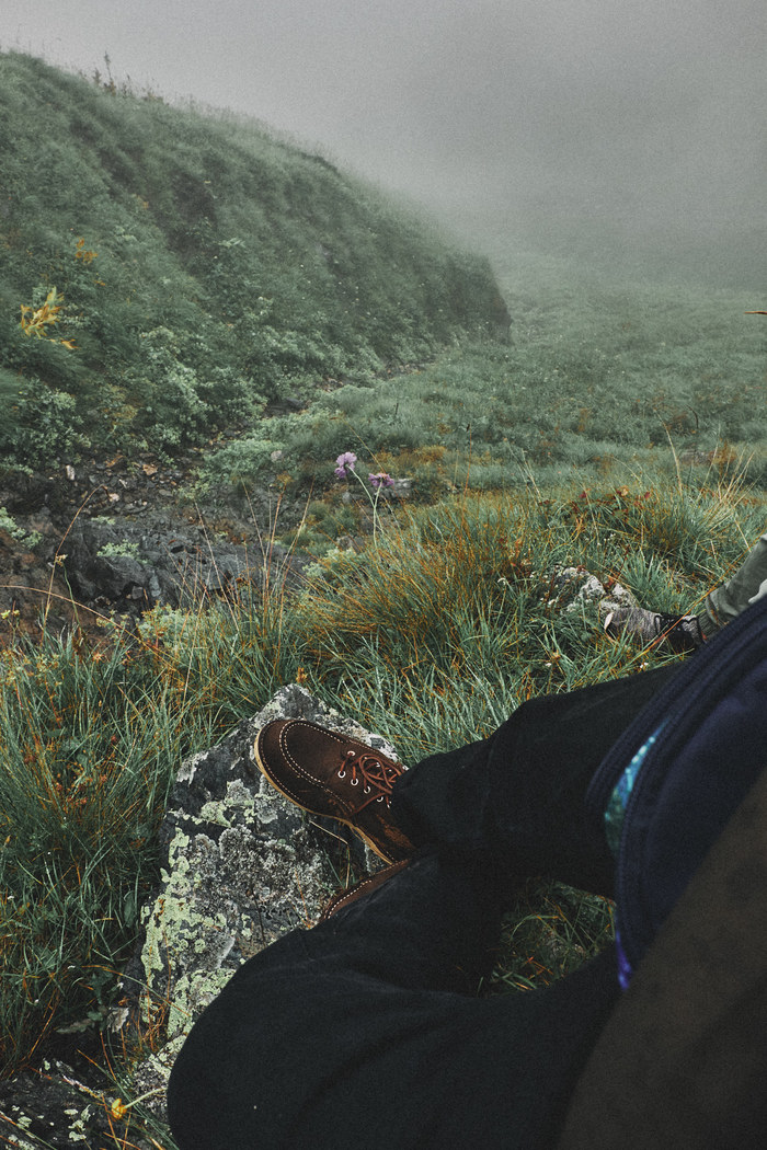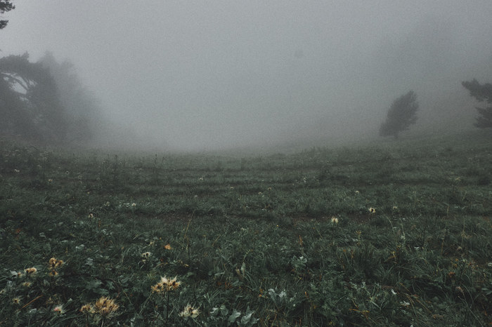 Сойдя с канатной дороги, мы не придумали ничего лучше, чем просто пойти по ближайшей тропе неизвестно куда, в туман. Мы надеялись, что она нас приведет к пику. Мы не очень умные, помните?