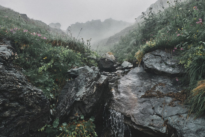 Туман, скрывающий дорогу перед тобой и тысячи метров склона сбоку, создавал непередаваемую атмосферу. Мы шли дальше, пока тропинка не уперлась в горный ступенчатый ручей. Наверняка тропинка вела и дальше, но из-за тумана мы ее просто не увидели.