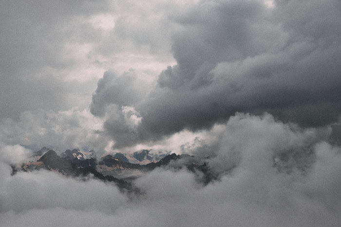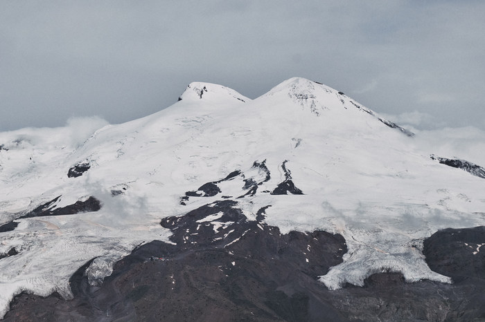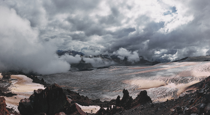 Нам ОЧЕНЬ сильно повезло, потому что пока мы поднимались, ветрами, дующими с Черного моря, где-то на час Эльбрус полностью оголился от облаков, скрывающих его пики, но эти же ветра затем принесли с собой облака, которые вновь затянули Эльбрус.
