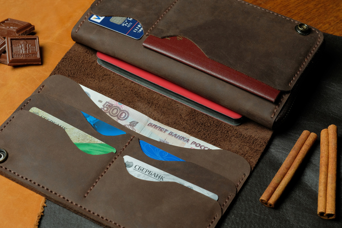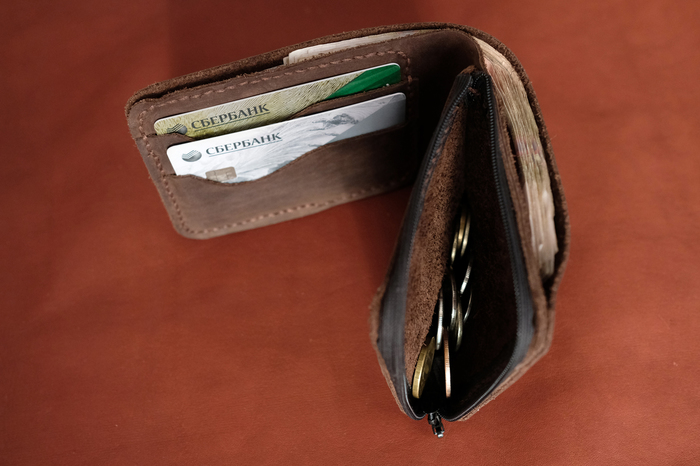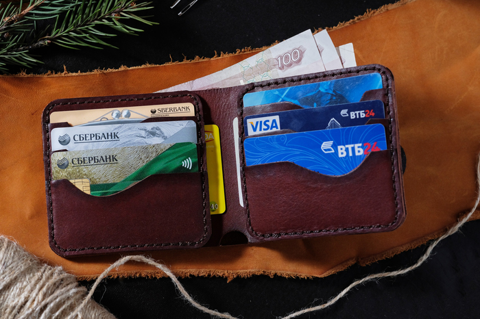 В какой-то момент у меня появилась мысль в голове, а почему бы не сделать себе что-то крутое из кожи. Посмотрел видео на ютубе, желание только усилилось. Но как это часто бывает, идея эта позабылась, но через несколько недель у меня в голове щелкнуло, и я сходил в ближайший магазин с тканями, и купил там обрезки кожи на 50 рублей, шило и нить. Я, как технарь, люблю практичность, поэтому решил сделать себе максимально компактный кошелек, тем более, что меня ограничивали маленькие обрезки кожи. Получилось вот что: отдел под купюры, 3 карты, мелочь.