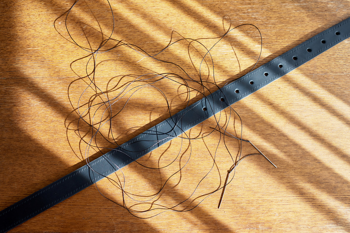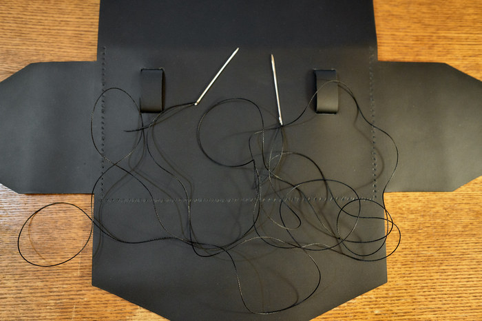Я не говорил ранее, но сумка полностью ручной работы. Каждая дырочка и каждый стежок сделан в ручную. На ремень ушло 6,4 метра нити! И все это прошито ручками.
