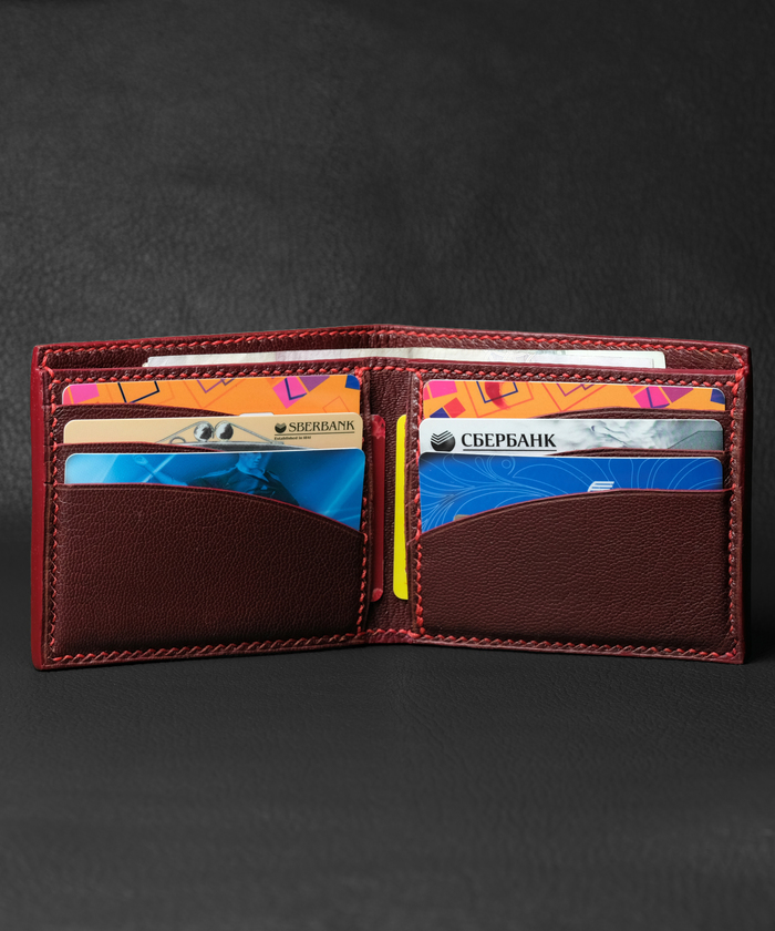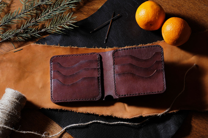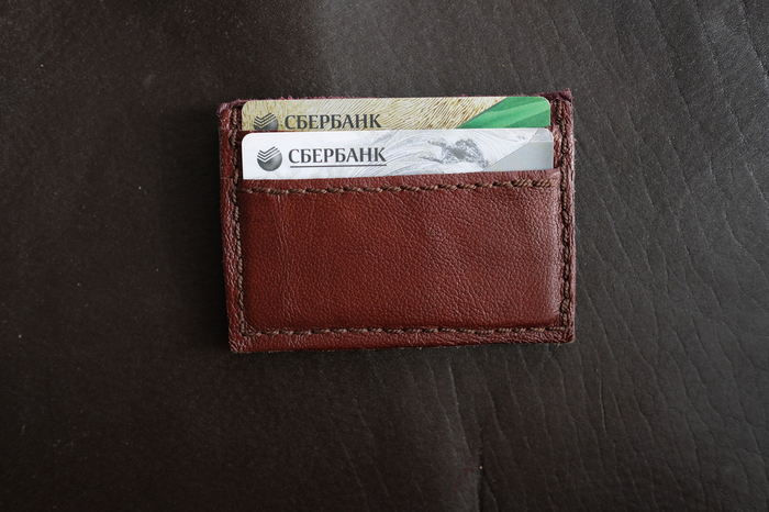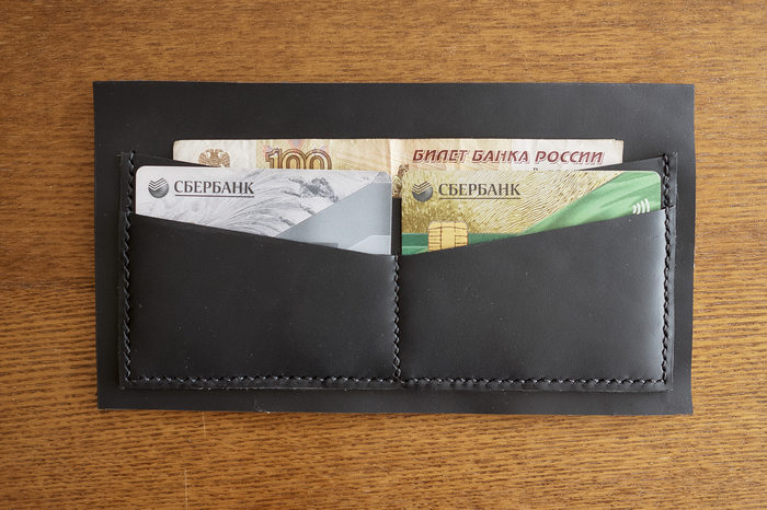 Делал шилом и дурацкими, вечно закручивающимися, нитками. Это было больно :D Но я хожу с ним до сих пор и считаю, что это самый идеальный формфактор по соотношению размер \ функциональность (3 карты, деньги, мелочь)