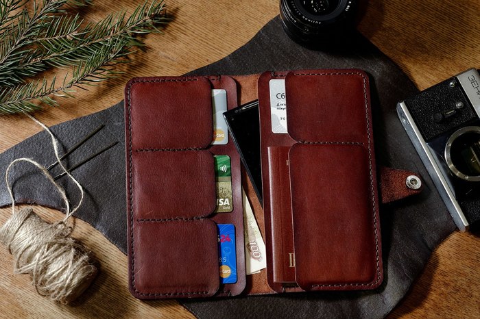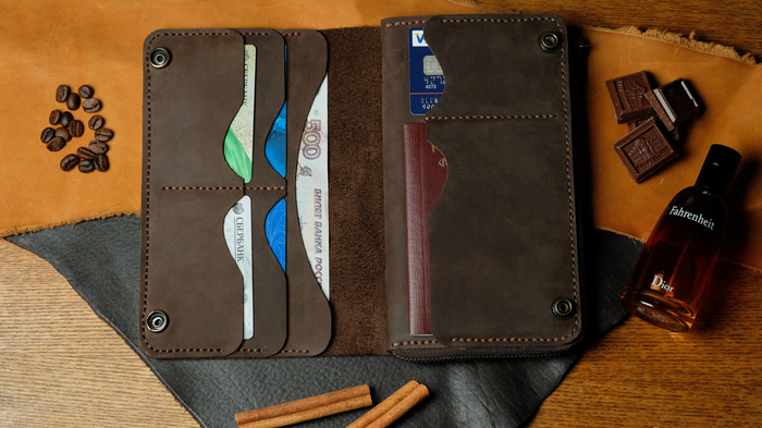 Влезает смартфон, блокнот, паспорт, 5 карт, купюры, мелочь и еще один свободный отдел