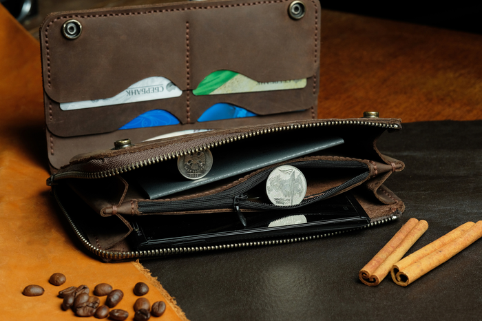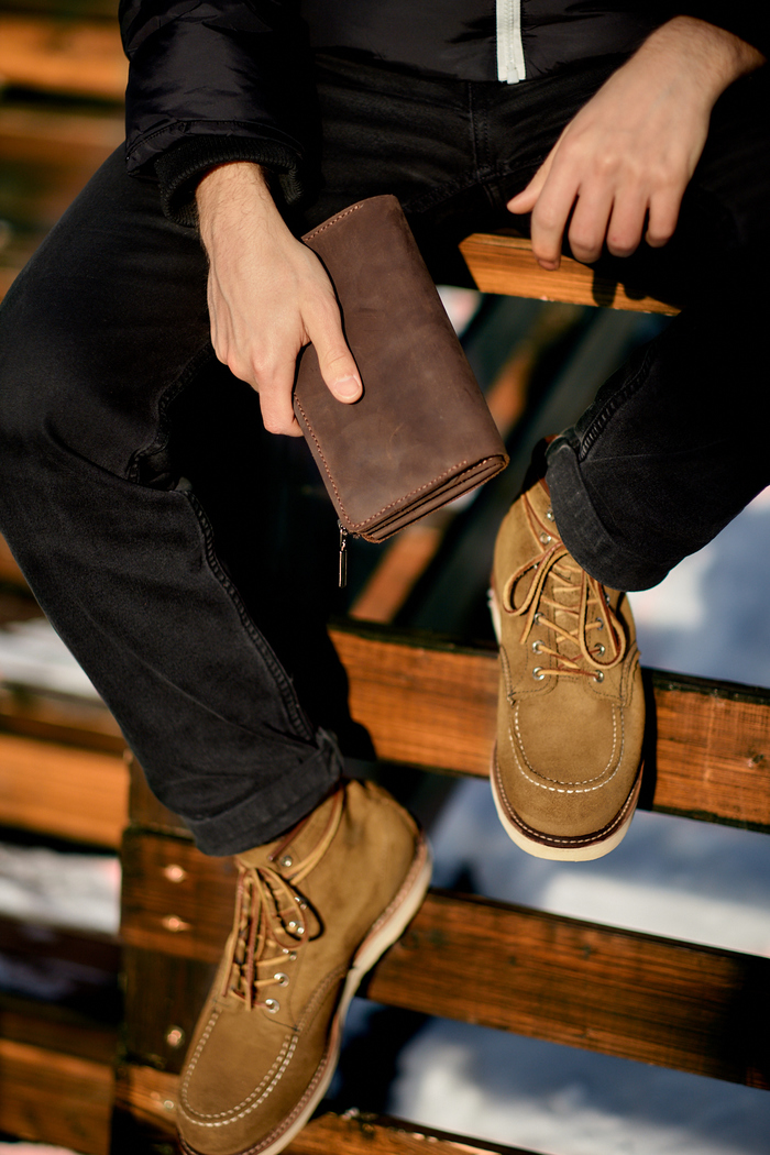 В комплекте с портмоне идет мини-кошелек, который можно прикрепить к портмоне изнутри на клепки, а когда захочется пойти налегке, например, на прогулку, кошелек отсоединяется от портмоне и его можно положить в карман джинс: