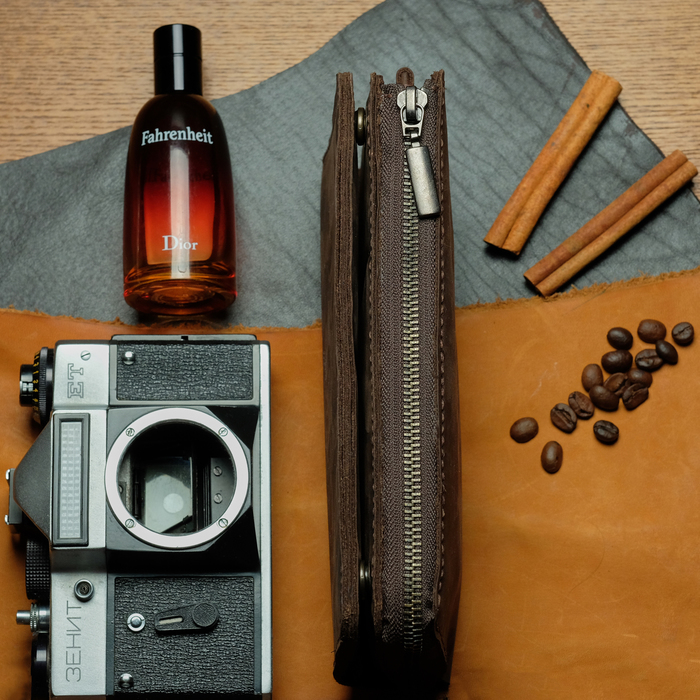 Тут я понял, что хочу большего. Купил кожу крейзихорс российского производства. И некоторые инструменты. Сразу же выбрал достаточно сложную модель клатча: