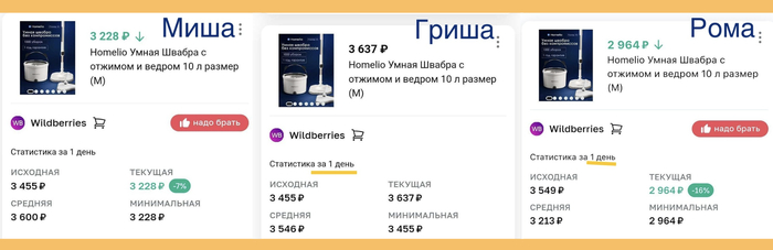 Перемотаем вперед, на 4 день наблюдения видим, что у меня та же комедия со шваброй и цена ниже всех, и скидка самая внушительная, Вайлдберриз, на что ты намекаешь?