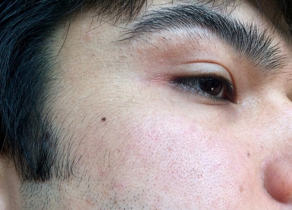 Делая контрольные фотографии я старался максимально сохранить угол, ракурс и уровень освещения. Две нижние фиолетовые линии даны для ориентира на родинки, две красные для того, чтобы визуально оценить эффект препарата.