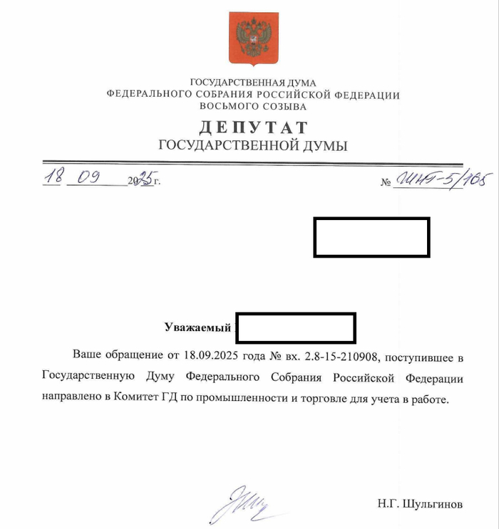 Вот мой первый пост Написал обращение к депутату от своего региона по Утильсбору