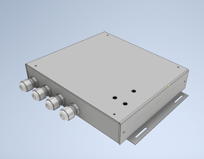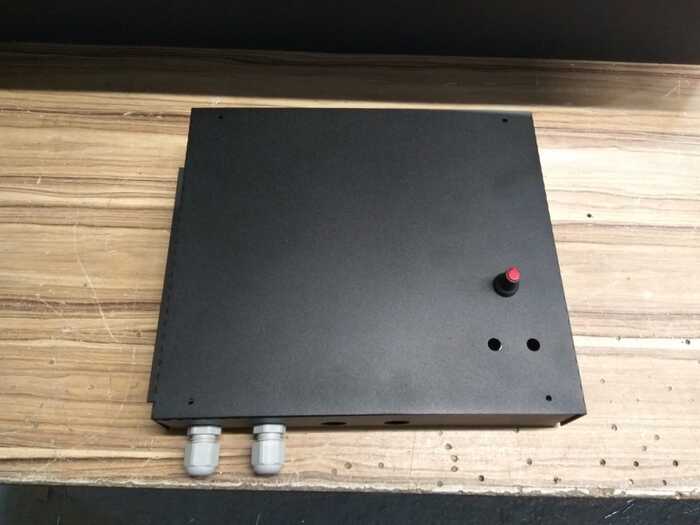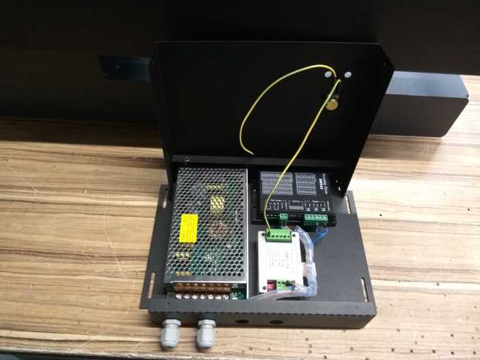 Вид той самой коробки управления на стадии проекта, почему четыре кабельных ввода ?, первый это питание 220 в, второй - шаговый двигатель, третий - концевики, четвертый - дублирующие кнопки (пуск - стоп).