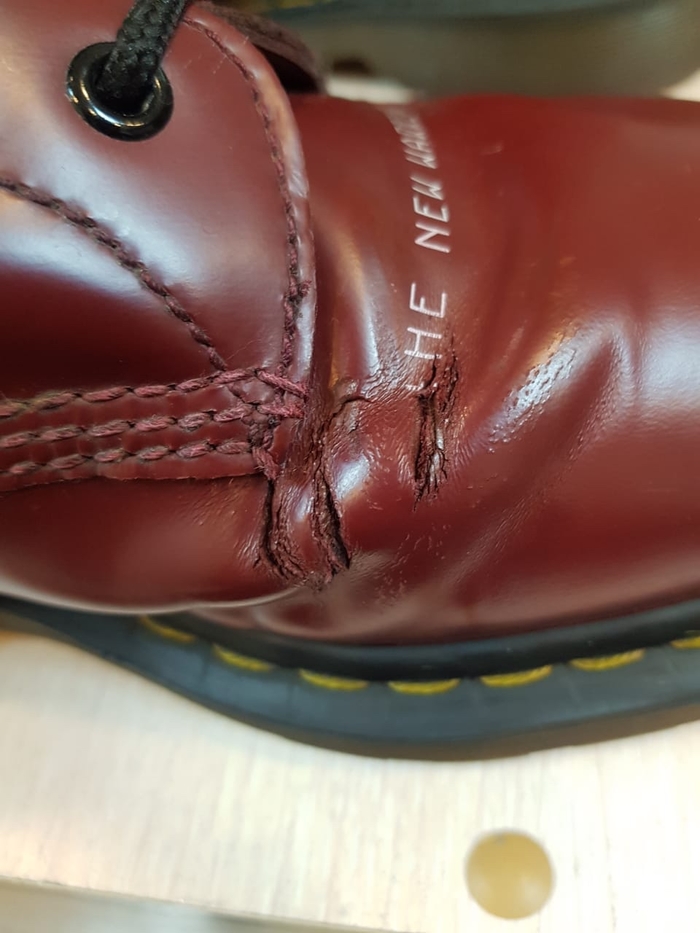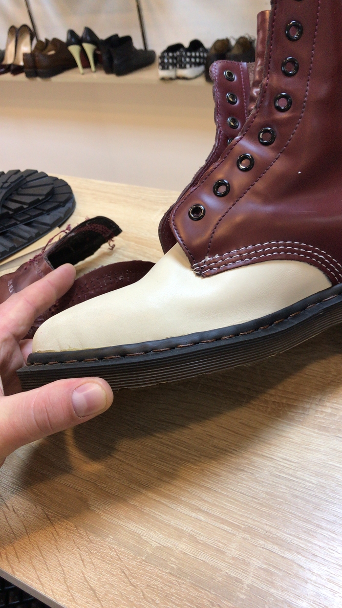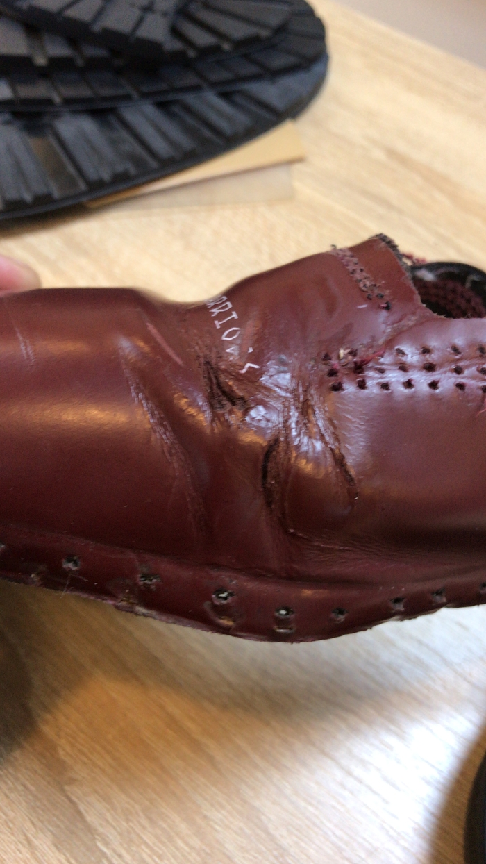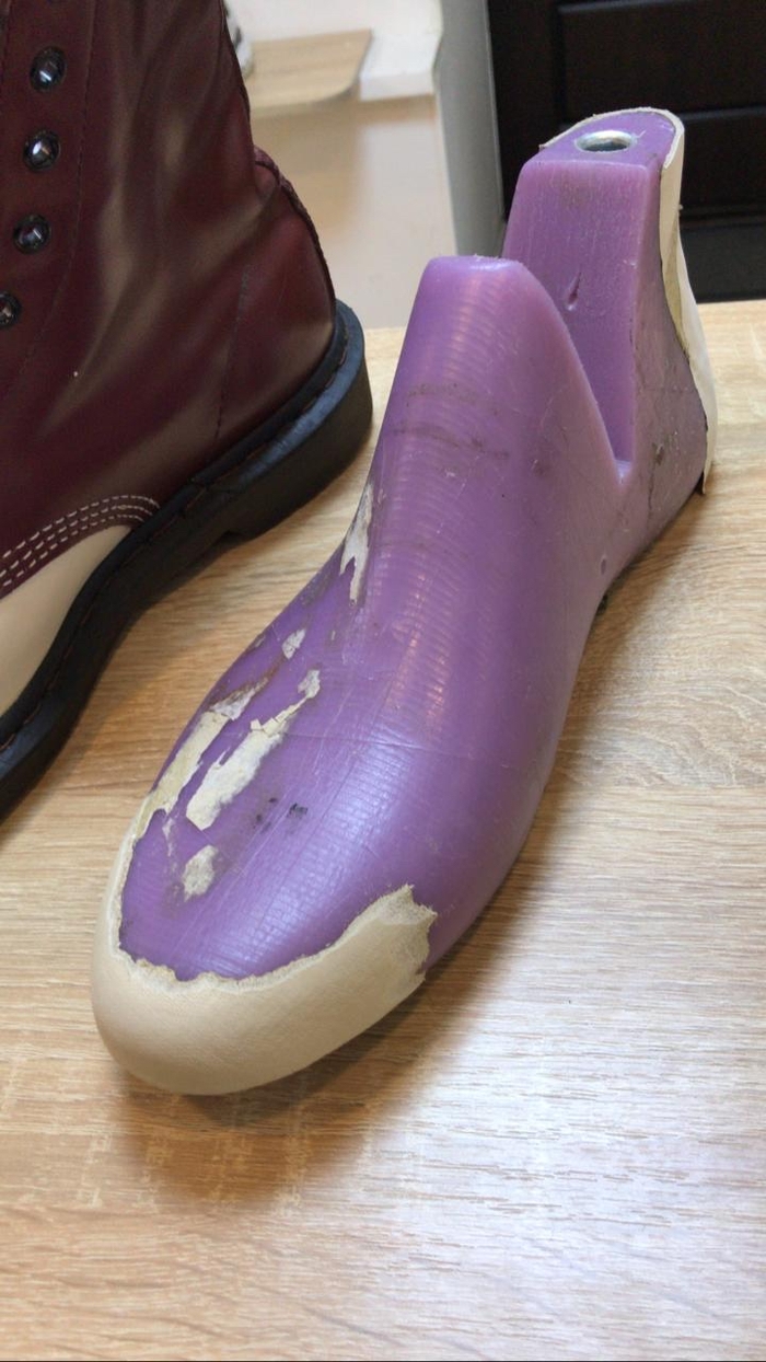 Вот колодка. Часто приносят от других мастеров и говорят что после ремонта носить не возможно. Зато сделали за 4000₽. Там 2 варианта, либо просто обтянули кожей и обрезали у ранта или реально заменили но без колодки.