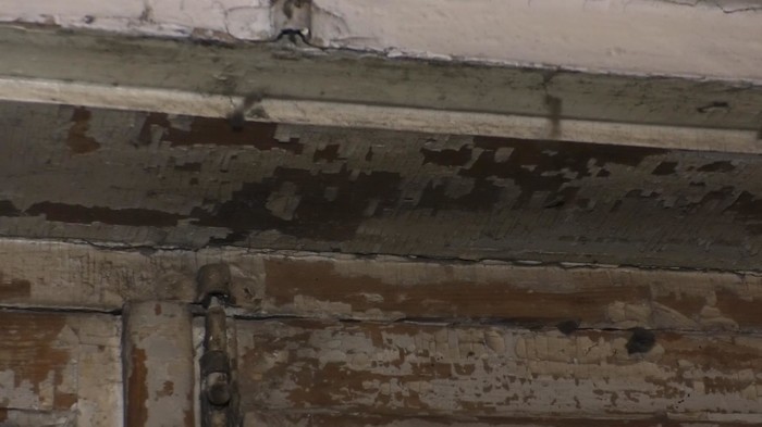 В прогнивших окнах квартиры видны огромные щели, кое-где стёкол вообще нет — из них сильно дует. Естественно, в тридцатиградусный мороз в доме очень холодно. Батареи отрезаны от труб, на потолке — плесень.
