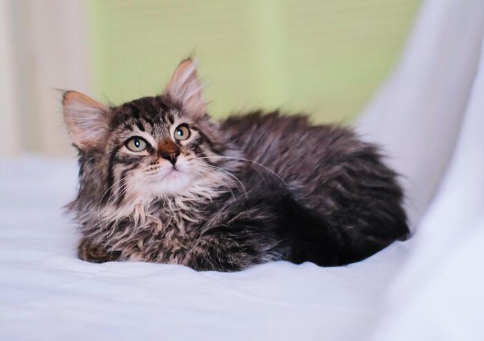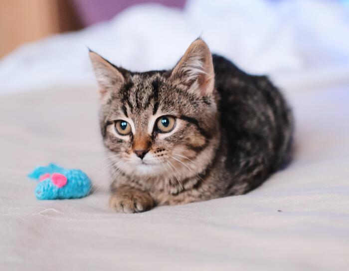 Девочка окраса табби, возраст около 2.5-3 мес. Спасена с улицы, и находится в поиске дома. Малышка очень спокойная. Она будет спокойно лежать у вас на коленочках и снимать стресс своим мурчанием. С удовольствием подставляет животик для поглаживаний.