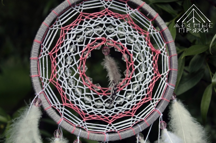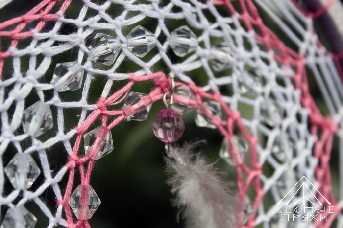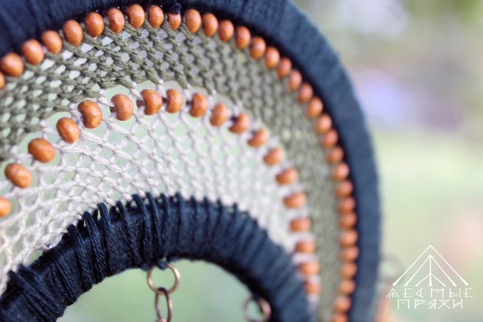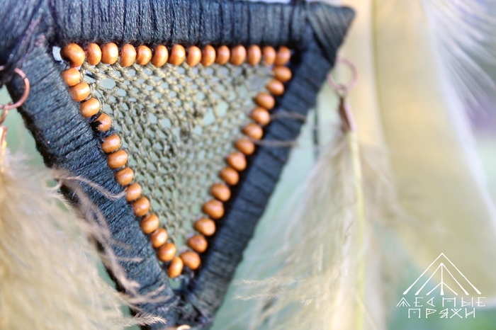 Берёзовая фанера, хлопковая нить, деревянные бусины, металлическая фурнитура и перья гуся.