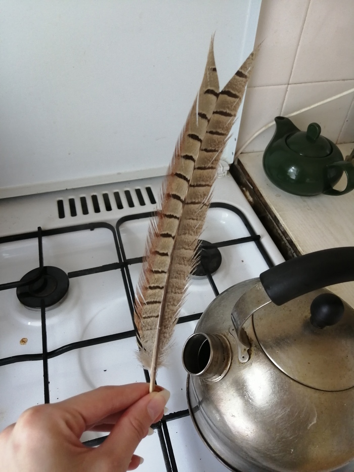 Недавно мне подарили перья фазана. Их состояние было таково, что подумалось - фазан без боя их явно не отдал. Чтобы понять их истинное состояние, требовалось восстановить перья. Обычно я делаю это с помощью пара.