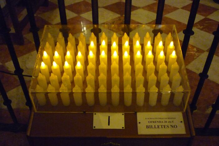 Наверное, вы уже в курсе, что на Западе католические церкви давно уже идут по пути технического прогресса? В Испании, например, вместо восковых свечей давно установлены светодиодные в специальной консоли, оснащенном монетоприёмником или платежным терминалом. Все очень просто и продвинуто - кидаешь монетку (или проводишь картой) и загорается светодиодная свеча, а сообщение на небеса уже послано.