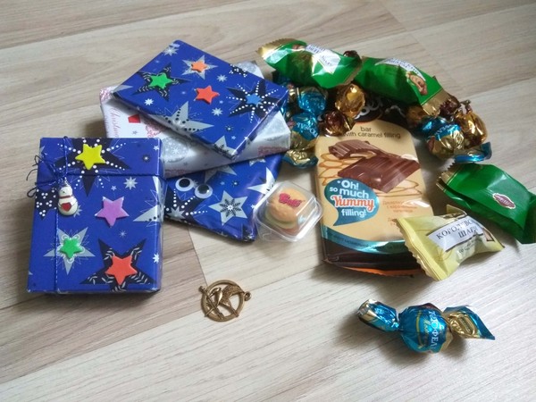 Внутри оказался кулон с сойкой-пересмешницей, блокнотик с картиной Ван Гога, ароматизированные свечи, подставка под кружку, куча моих любимых конфет и...