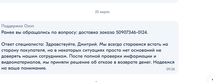 И вот этот день настал, 23-го числа меня решили осчастливить сообщением, что оказывается я пытаюсь обмануть бедную компанию Ozon, и у них нет повода не доверять своим кристально честным сотрудникам.