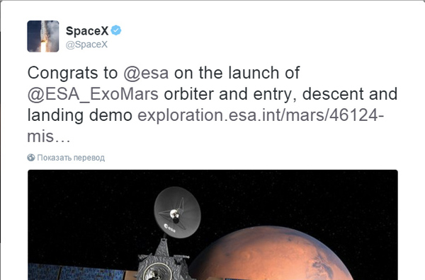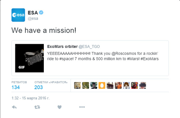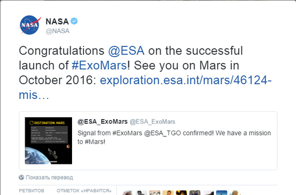 А вот в Твиттере EКA после успешного отделения космического аппарата ExoMars Trace Gas Orbiter появилась благодарность Роскосмосу за успешно произведенный запуск.