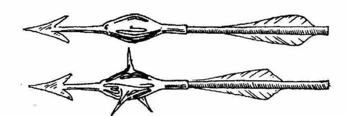 Железное острие - чаще всего подтреугольное, плоское, с двумя хищно смотрящими назад зубцами, но есть и трехлопастные, и ланцетовидные. Железный же стержень, выкованный заодно с острием и уходящий в увесистый свинцовый утяжелитель. Крепление к древку было черешковым, хвостовик стержня вставлялся в пропил древка, но иногда встречается и втулка - более прогрессивный способ. В любом случае, место соединения хвостовика с древком усиливалось заклепкой, а сверху на это дело насаживалась свинцовая муфта, игравшая двойную роль: и для прочности соединения, и для утяжеления всей конструкции. Причем - обратите внимание! - муфта радикально смещала баланс оружия именно к острию.