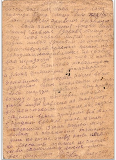 А самая главная здаровя. Тепер пару слов о своей жизне. Живу так ладна живой здаровай но нахожусь в дествующей Краснай армие на западном направление но сообщу вам нерадость …что я потерял сваево блискава товарища и зятя Дмитрия Тихановича Истомина каторай пагиб вбаю за деревню брын осколами вражескава снаряда разбило ему правую косицу и груд которые отняли унево жизн навечна но товарищи не аставили наполе боя под обстрелом врага прибрали все тела и придали в земле. Убило 10 человек похоронили 13 числа марта месяца вот там я пережил тяжелые дни но сечас живу пака ниче. но васса не печалься живи спакойно и лечис пака все.