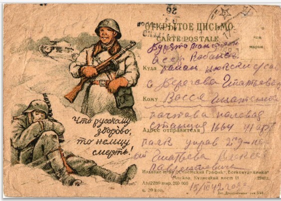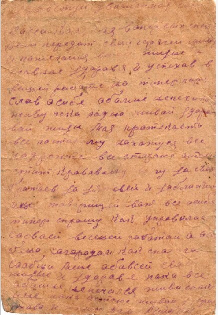 «Здравствуйте уважаемая семья Васса, Коля Вам привет передает свой горячий и пожелания вашей жизне и главное здоровья и успехав в вашей работе но теперь пару слов о сибе обо мне не печальтесь Живу пака ладно живой здоровый жизнь моя протекает все по старому нахожусь все на фронте все стараюс отомстить крававому врагу из за своих братьев и за своих близких и товарищей. вот и все осибе Теперь спрошу как управились со своей весенней работой а особенно сагародами как (…)