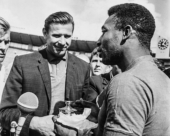 Советский футболист, вратарь Лев Яшин дарит бразильскому футболисту Пеле миниатюрный самовар на предматчевой тренировке на Центральном стадионе им. Ленина (нынешний «Стадион Лужники»). СССР, 1965 год.